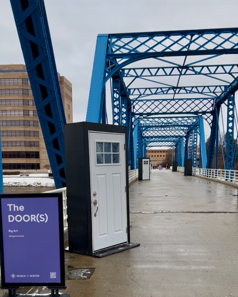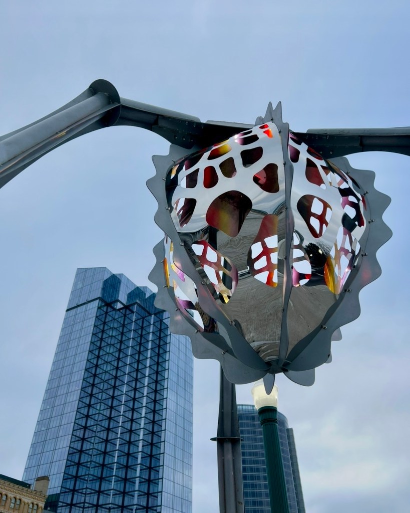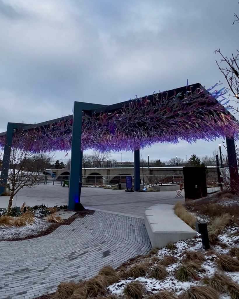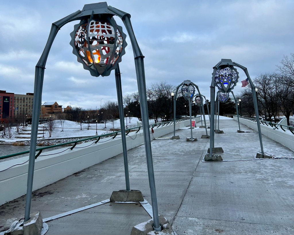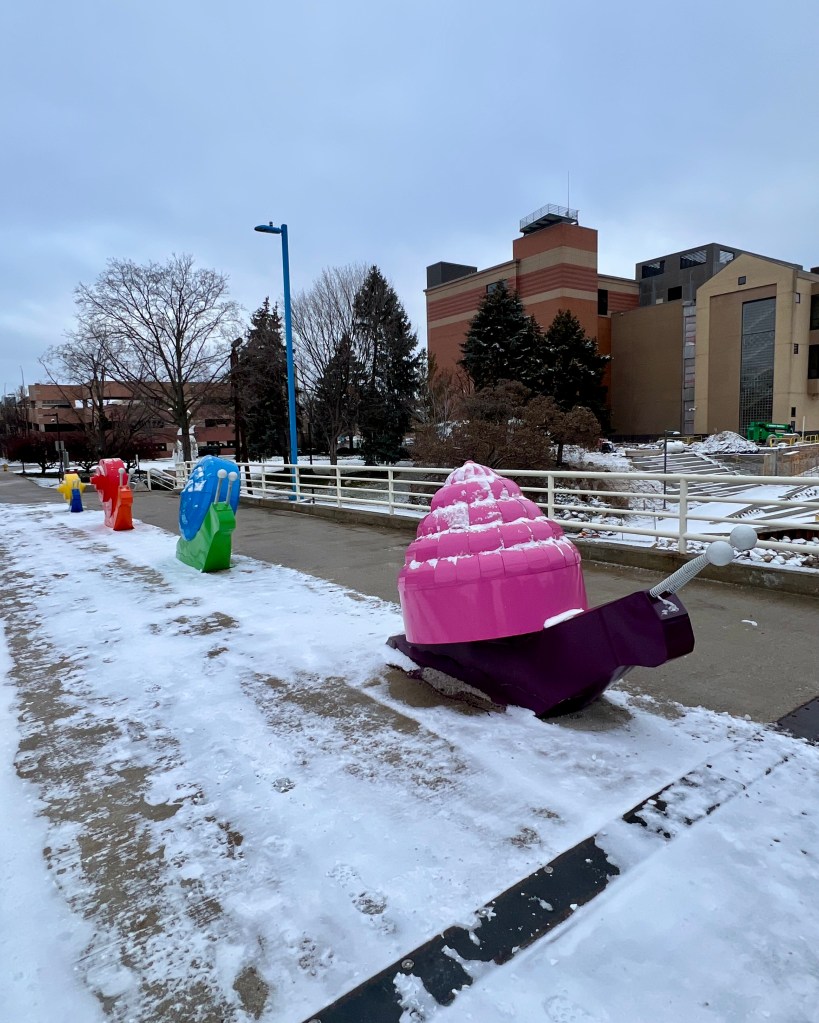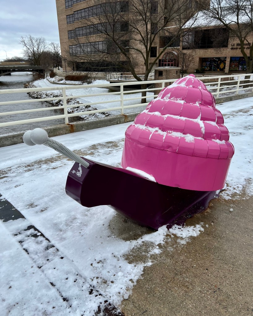 Closing out my art installation exploration were It’s A Breeze by ImpactPlan and Downtown Grand Rapids Inc., and Slow Motion by Valerie Wahna and Downtown Grand Rapids Inc. It’s A Breeze was a sensory experience for the eyes and ears. When the streamers blow in the wind they look like waves and sound like instruments you’d find at a meditation retreat. The snails in Slow Motion brought fun, joyful pops of color to the grey concrete of the Blue Bridge that they call home.