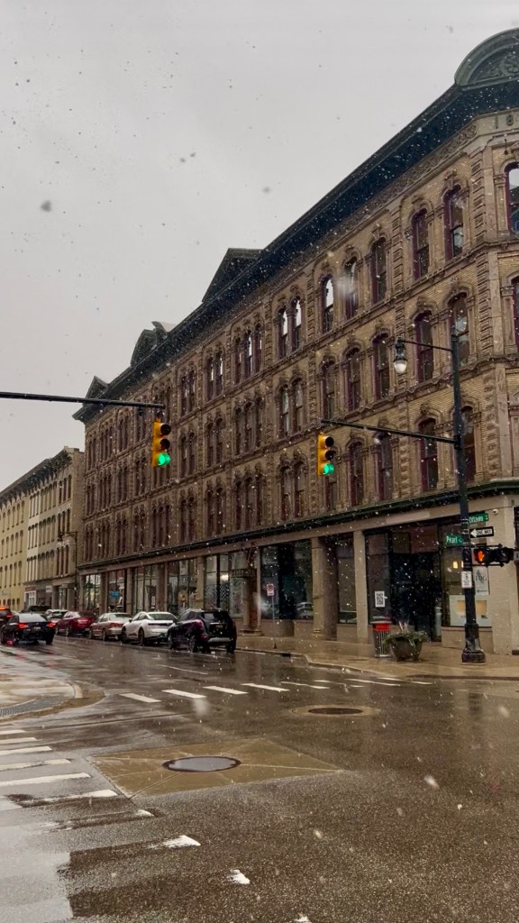 When I drove in midday, cold temperatures and snow were already setting the scene for a Hallmark-movie weekend in Michigan’s winter wonderland. Determined not to let the weather get in the way of my enjoying the city, I dug down deep to find the strength of my Michigander ancestors and enjoy the snow globe I found myself in. Life is all about perspective. Once I looked up and took in the flurries with the city in the background, I remembered there’s beauty in winter, too.